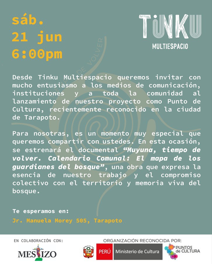 El sábado 21 de Junio, desde Tinku Multiespacio se hizo el lanzamiento de nuestro proyecto como Punto de Cultura, recientemente reconocido en la ciudad de Tarapoto.